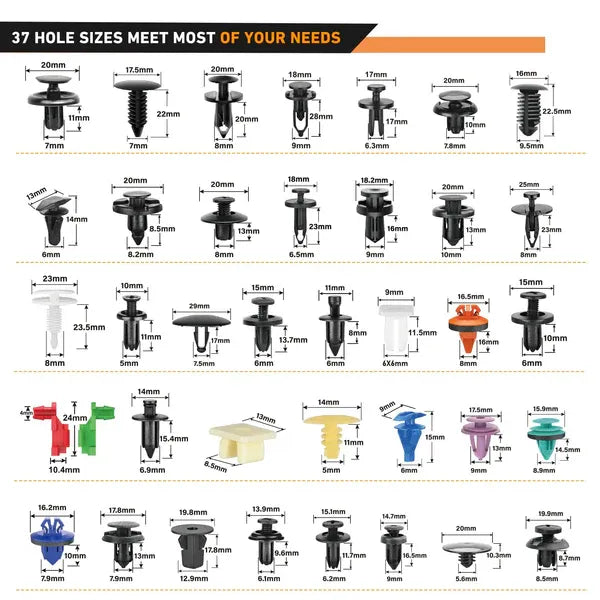 This fastener retainer clips include 26 most common sizes replacement for GM, Ford, Chrysler, Toyota, Honda, Nissan, Mazda,Chevy,Jeep etc. But NOT ONLY for these cars, if the sizes and shape meet your needs well, it's also a useful kit .The push clips are widely used for door panel, door trim clips, bumper clips,interior accessories and splash shield retainers replacement. All thenecessary retainers for exact replacement of old and broken retainer. It also can work on other applications like motor, furniture and electronic equipment.